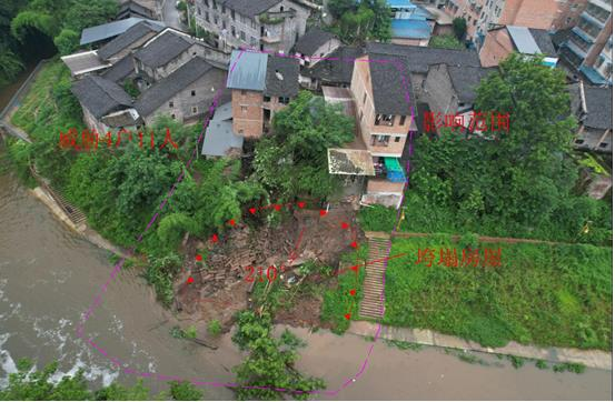 6月21日11时30分,武隆区长坝镇胜利村凉水洞滑坡点群测群防员杨朝仿在雨中巡查时,发现该滑坡体有异动情况,变形体体积约4.08万立方米,严重威胁监测点内5户11人安全,于是立即上报。接报后,镇政府第一时间赶赴现场,同步与区规划自然资源局、驻守工程师电线分钟内将受威胁区内人员全部紧急转移。14时10分左右,滑坡体变形加剧,上部基本滑塌,阻断村道公路。因监测及时、处置得当、转移果断,无人员伤亡。
