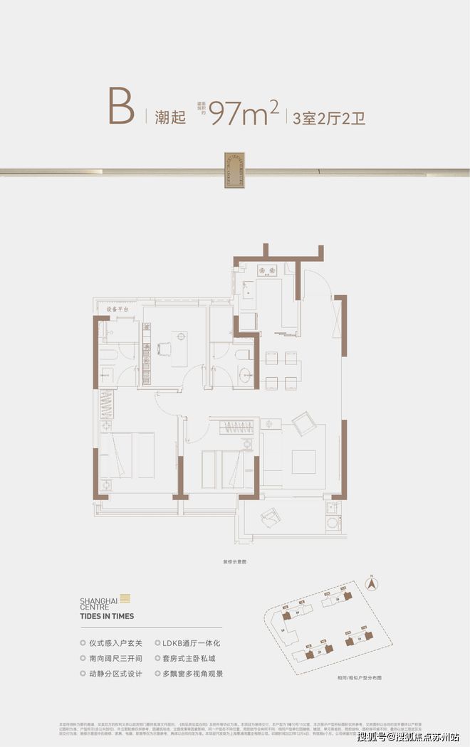 建面约95-97㎡3房2卫,2卫的设计保证了早晚高峰抢厕所的问题,并且主卧套房设计也保证了主人的私密空间。