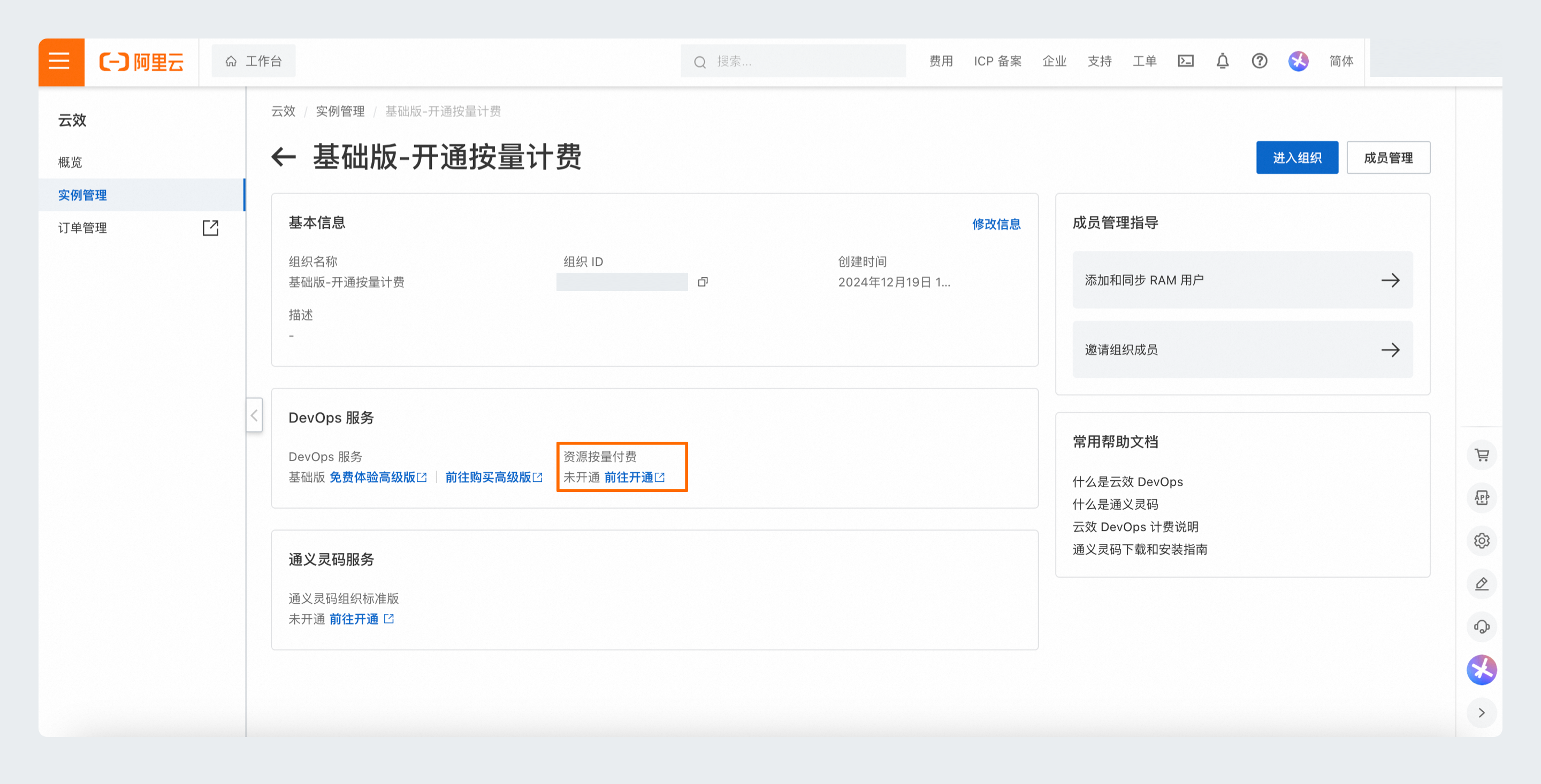 使用以上身份登录云效管理台,在实例管理列表中选择目标实例,点击实例名称进入实例详情,选择购买高级版或开通按量计费。